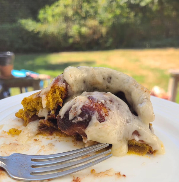 Pumpkin spice roll loaded with tons of cinnamon and sugar & topped with a vanilla buttercream icing